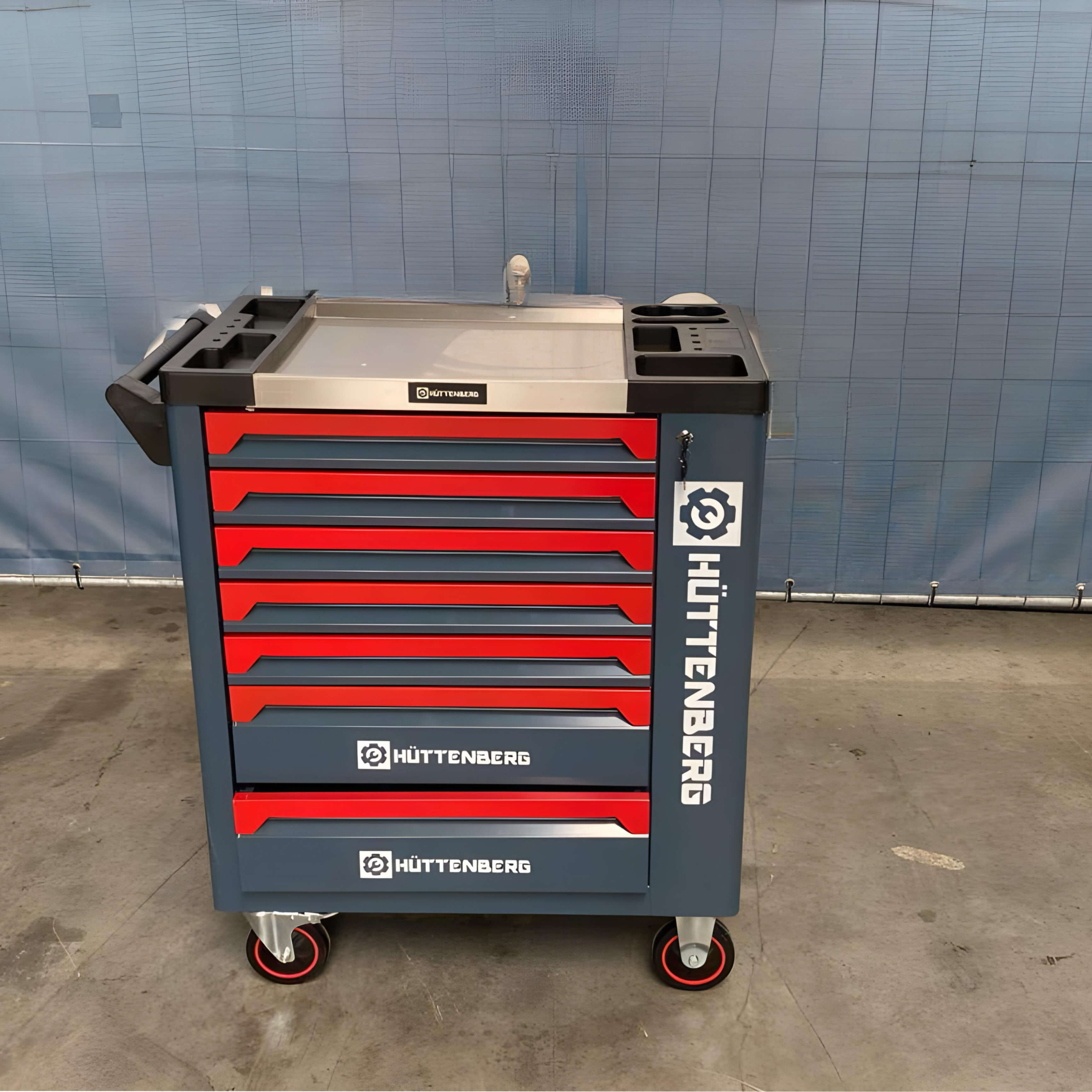 Con 4 ruote, di cui 2 piroettanti con freno, e serratura con 2 chiavi incluse, questo carrello è facile da spostare e garantisce la sicurezza degli utensili.